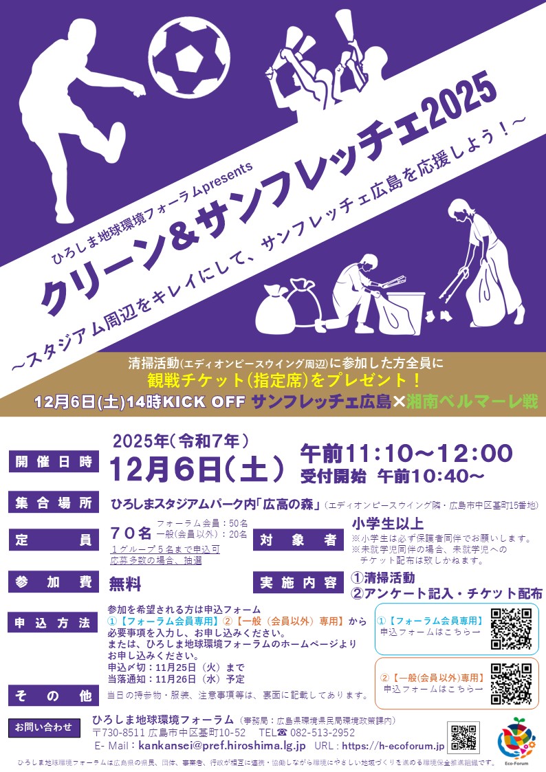 ひろしま地球環境フォーラムでは、環境活動実践事業の取組みの一環として、12月6日(土)エディオンピースウイング周辺で清掃活動を行います。